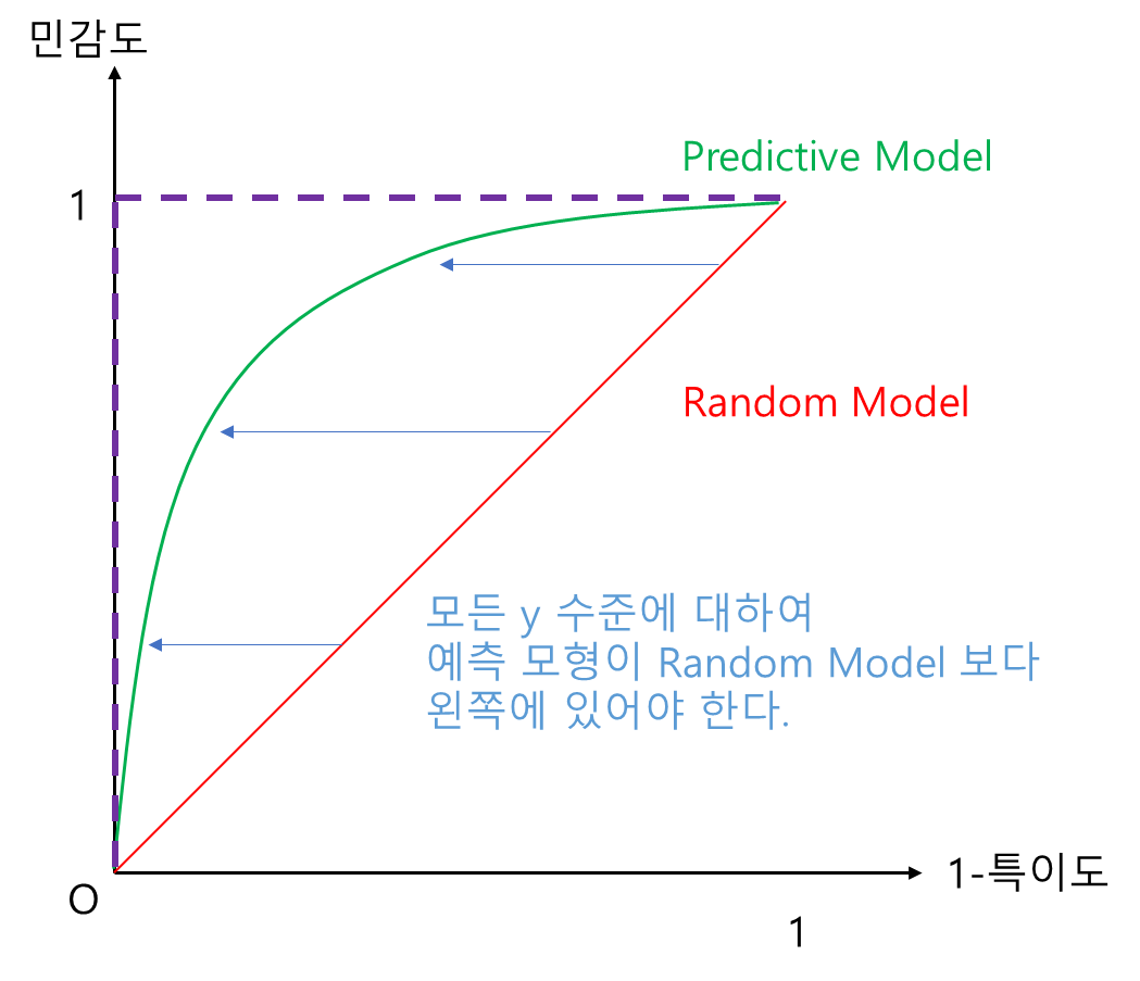 그림과 함께 살펴보자. 일단 예측 모형(초록선)은 당연히 Random Model(빨간 선) 보다는 좋아야 할 것이다. 즉, 예측 모형은 모든 x(1-특이도) 수준에 대하여 Random Model 보다 y값(민감도)이 커야 하며 다시 말해 y축 방향으로 Random Model 보다 위에 있어야 한다(왼쪽 그림). 또한 모든 y(민감도) 수준에 대하여 x값 (1-특이도) 값은 작을수록 좋으며 다시 말해 Random Model 보다 x축 방향으로 왼쪽에 있어야 한다(오른쪽 그림). 또한 민감도와 1-특이도는 모두 0과 1 사이 값을 가지므로 보라색 점선과 같은 경계를 가진다. 이 경계가 가장 Perfect 한 모형이 된다. 쉽게 말해 ROC 곡선이 좌상단으로 쏠려 있을수록 좋은 것이다.