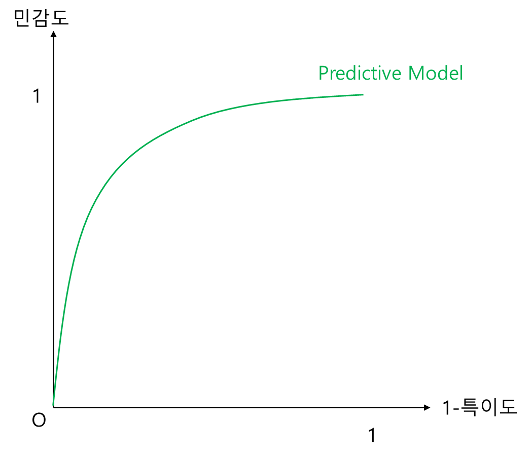 또한 여러 절단값에 따른 민감도와 특이도의 관계를 그림으로 표현할 수 있는데 아래 그림과 같이 민감도와 1-특이도를 계산하여 2차원 평면에 그릴 수 있다. 왜 민감도와 특이도가 아닌 민감도와 1-특이도의 관계인지는 아래에서 설명한다.