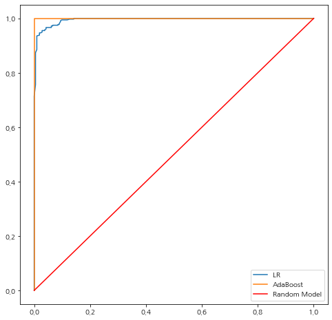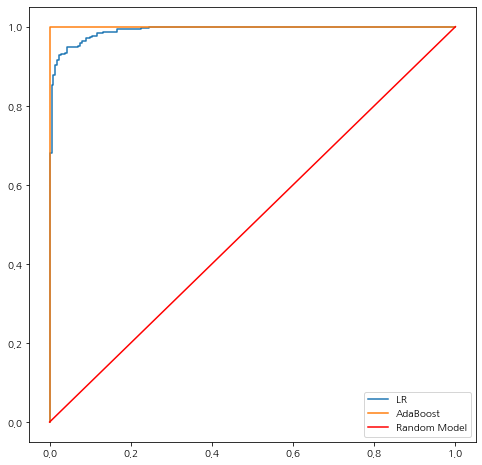 AdaBoost 모형의 AUC가 1이 나왔다. ㄷㄷ;; 이 데이터에 대해서는 퍼펙트 성능을 보여주었다.