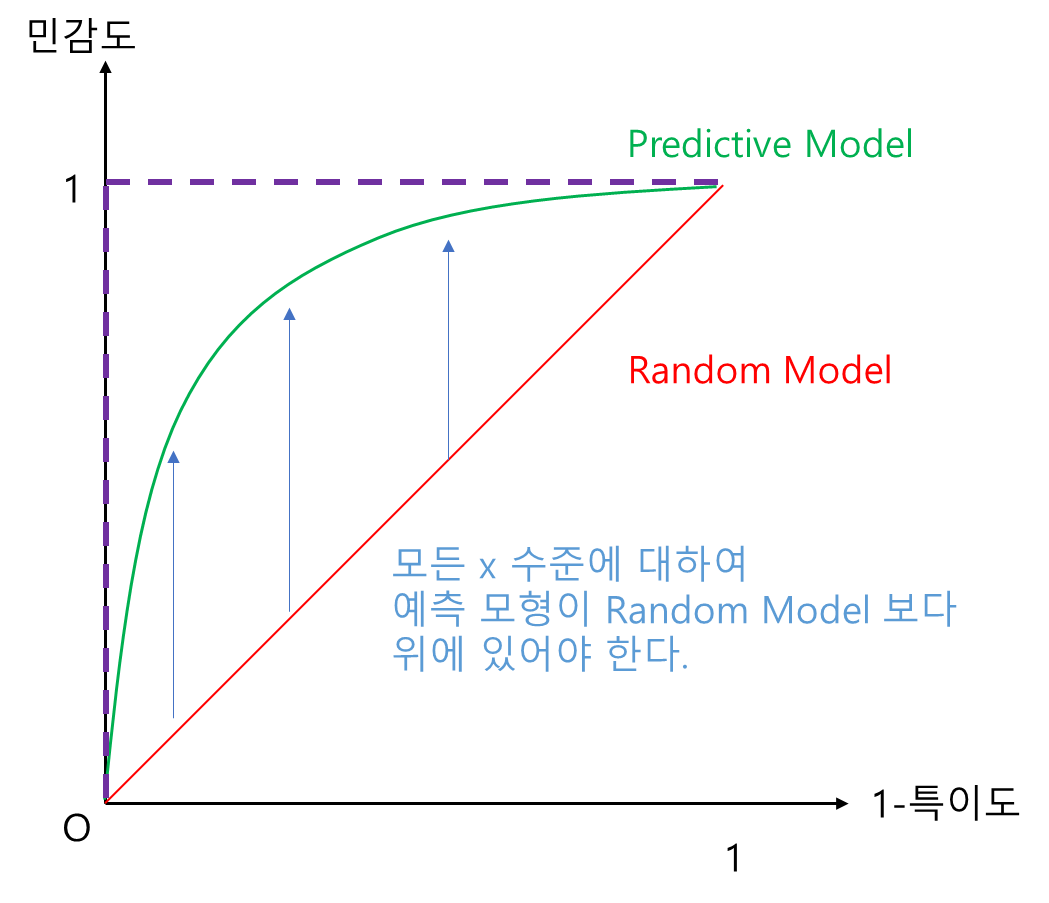 ROC 곡선 아래의 면적이므로 AUC는 0과 1 사이의 값을 가지며 Random Model의 경우는 0.5가 된다. 따라서 기본적으로 0.5보다는 커야 예측 모형이 제 구실을 할 수 있다고 본다.