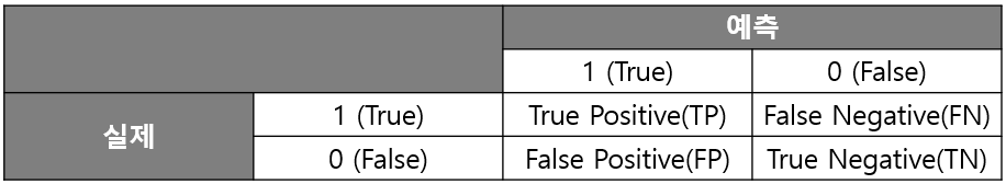 이처럼 특정 데이터를 1로 분류할지 말지를 결정하는 상수 $c$를 절단값이라 하겠다. 주어진 절단값을 이용하여 분류를 하게 되면 아래와 같이 2X2 혼동행렬(Confusion Matrix)을 만들 수 있다.