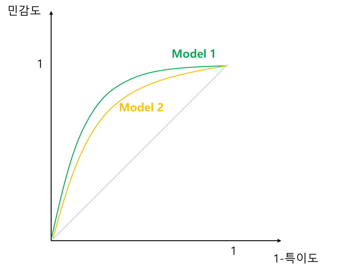 그렇다면 ROC 곡선은 왜 그리는 걸까? 단순히 특이도와 민감도의 관계를 보기 위한 것도 있지만 여러 모형의 성능을 시각적으로 비교하기 위해 ROC 곡선을 사용한다.