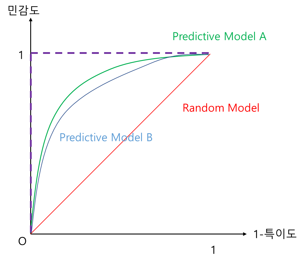 지금까지 얘기한 것은 ROC 곡선을 통하여 예측 모형의 최소 자격 요건을 만족하는지(Random Model보다 좋은지) 살펴본 것이다. ROC 곡선은 여러 예측 모형 간 비교도 가능하게 해 준다. 앞에서 살펴본 내용과 본질은 같다. 모든 x(1-특이도) 수준에서 곡선이 좌상단에 쏠려 있는 모형이 더 좋은 것이다. 즉, 아래 그림에서 예측 모형 A가 B보다 성능이 좋다고 할 수 있다.