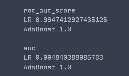 AdaBoost의 AUC는 직접 구현한 것과 똑같았고 로지스틱 회귀에 대해서는 직접 구현한 것뿐만 아니라 auc와 roc_auc_score 함수 간에도 약간의 차이를 보였다.