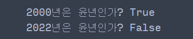 print('2022년은 윤년인가?', calendar.isleap(2022))