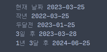 print('1년 3달 후', now+relativedelta(years=1, months=3))