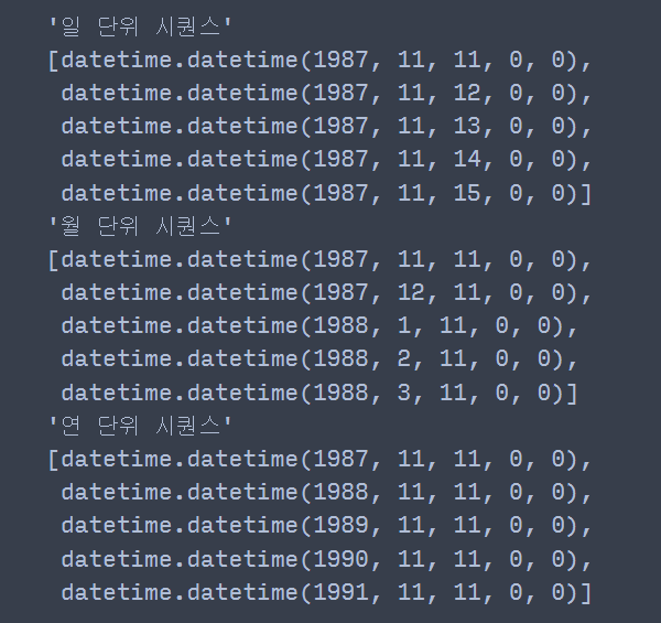 아래 코드는 1987년 11월 11일을 기준으로 일 단위, 월 단위, 연 단위로 5개의 원소를 갖는 시퀀스(배열)를 생성한다. 이때 rrule은 제너레이터이므로 list로 감싸서 배열로 만들어준다.