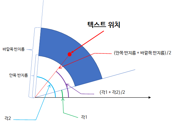 꽁냥이가 라벨을 표시할 텍스트의 위치는 파이 조각의 정중앙이에요. 따라서 파이 조각 정중앙의 x좌표와 y좌표를 구할 거예요. 그러기 위해서는 원점과 정중앙 사이의 거리를 알아야 하고요. 원점과 정중앙을 잇는 직선과 x축 사이의 각을 알아야 해요.