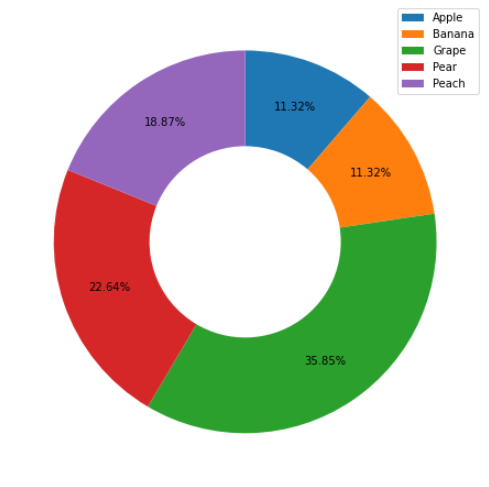 도넛 중앙에 전체 반지름의 절반 사이즈의 구멍을 만들기 위해서 width값을 0.5로 가지는 딕셔너리를 만들고요. 이를 wedgeprops인자에 넣었습니다.