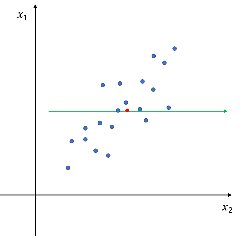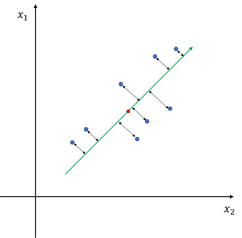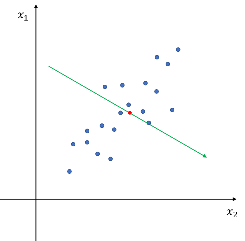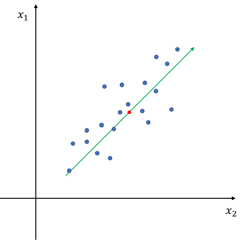즉, (1.3)은 정사영들의 분산을 최대화하는 직선을 찾는 문제와 같아지는 것이다. 이러한 직선(또는 축)을 찾는 과정이 바로 PCA이다.