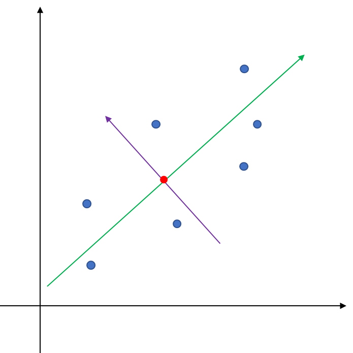 이러한 직선(또는 축)은 하나만 찾는 것이 아니며 이론적으로 $x_i$의 차원만큼의 축을 찾을 수 있다. 만약 아래 그림과 같이 정사영의 분산을 최대화하는 초록색 축을 찾았다면 이 축과 수직을 이루고 평균 벡터를 지나는 직선 중에서 정사영의 분산을 최대화하는 다음 축을 찾는다. 다음 축을 기존 축과 수직인 것들 중에서 찾는 이유는 일반적으로 두 축이 수직을 이루기 때문이다. 2차원 데이터에 대해서는 하나의 축을 찾았다면 나머지 하나의 축은 기존 축과 수직이면서 평균 벡터를 지나는 직선으로 바로 결정된다(아래 그림에서 보라색 화살표).