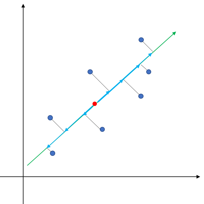 이 부분의 의미는 데이터를 $v$ 위로 투영시켰을 때 생기는 정사영의 길이의 제곱이다($\|v\|_2=1$이기 때문에 내적이 곧 정사영의 길이가 된다). 이때 데이터는 평균 벡터를 빼준 상황이므로 $v$위로 투영시켰을 때 생기는 새로운 데이터들의 분산과 관련되는 것이다(앞에 상수 $1/(n-1)$이 있어야 하나 최적화 문제에서는 빠져도 된다). 다시 말해 (1.5)는 아래 그림에서 데이터를 초록색 직선에 투영시키고 얻은 새로운 데이터를 파란 화살표라고 할 때 이 화살표 길이의 분산을 최대화하는 직선을 찾는 것과 동일하다는 것이다.