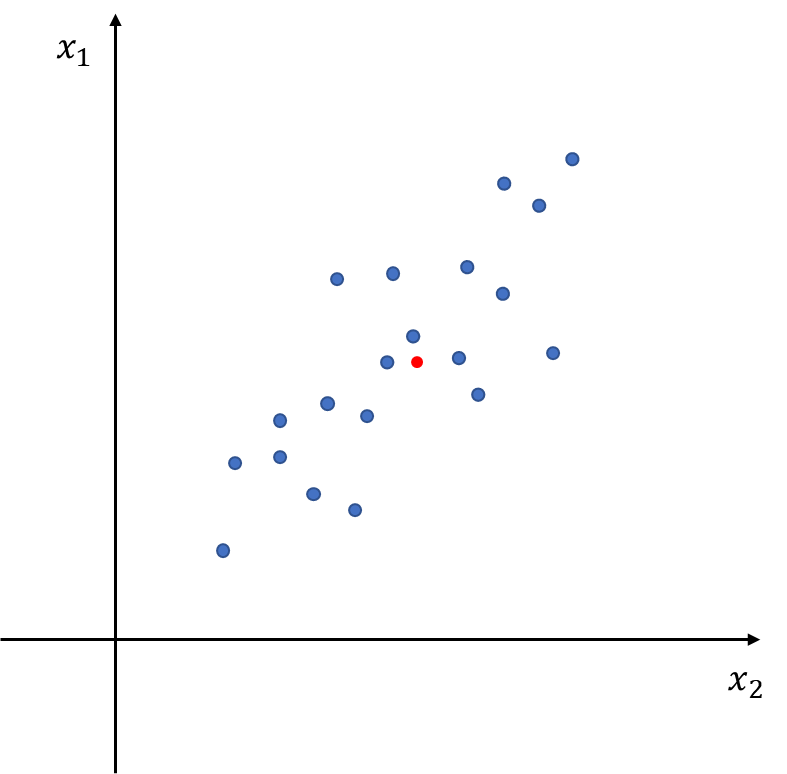 먼저 2차원 데이터가 다음과 같이 분포되어 있다고 해보자. 이때 빨간 점은 평균을 나타낸다.