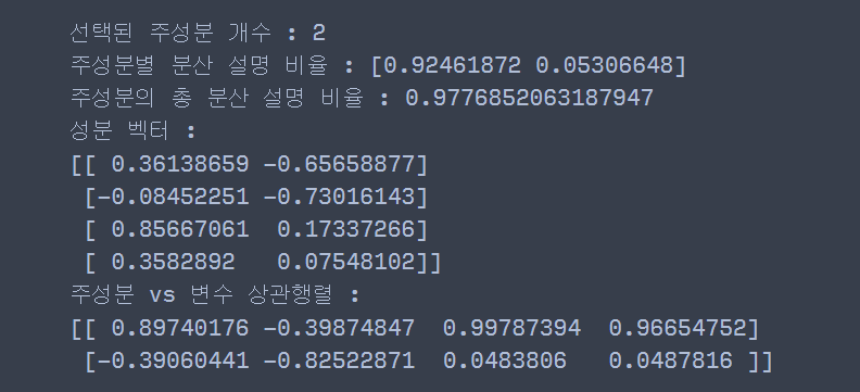 결과를 보면 총 4개의 설명 변수 중에서 단 2개의 주성분만으로 데이터의 총분산을 97.8% 설명한다는 것을 알 수 있다.