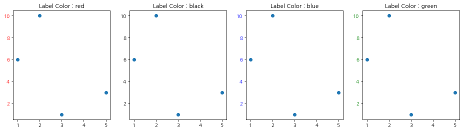 labelcolor를 사용하면 눈금 라벨 색상을 적용할 수 있습니다. 아래 코드는 y축에 대해서 눈금 라벨 색상을 빨강, 검정, 파랑, 초록으로 지정했을 때 결과를 보여줍니다.