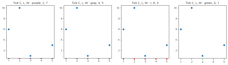 ax.set_title(f'Tick C, L, W : {tick_color_list[i]}, {tl}, {tick_width_list[i]}')