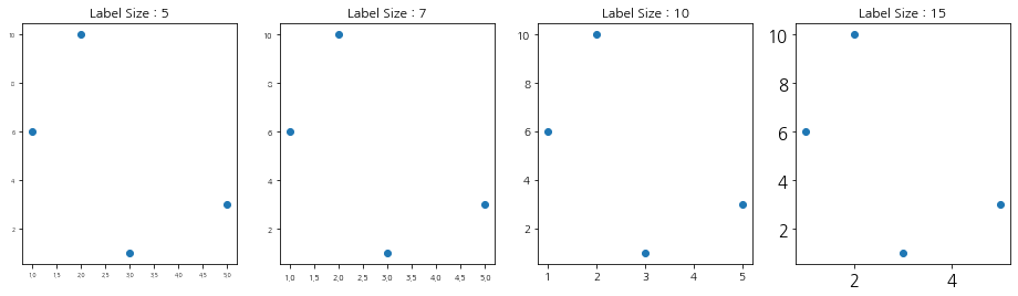 labelsize 인자를 이용하면 눈금 라벨 크기를 조절할 수 있습니다. 아래 코드는 labelsize를 5, 7, 10 그리고 15로 설정했을 때 x, y축 눈금 라벨 크기의 변화를 살펴본 것입니다.