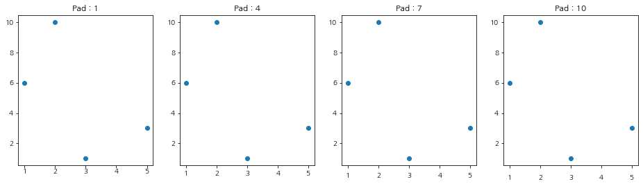 pad를 이용하면 눈금과 눈금 라벨 사이 공간을 조절할 수 있어요. 아래 코드는 x축 눈금과 눈금 라벨 사이 간격을 여러가지 값을 적용하여 확인해 본 것입니다.