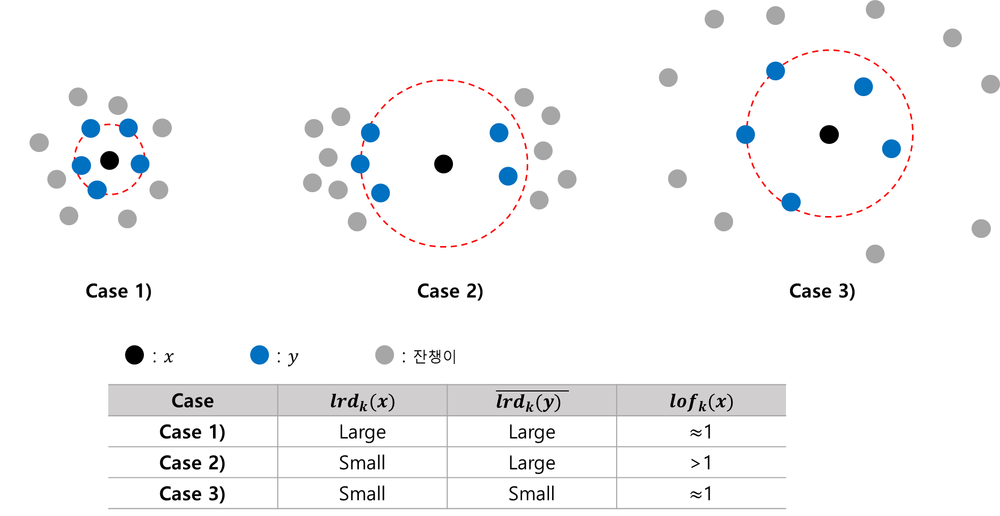첫 번째 경우는 $x$의 밀도($k$ 도달 가능 밀도)가 높고 주변 이웃의 평균 밀도 또한 높다. 따라서 LOF의 분모 분자가 모두 크므로(모두 비슷한 값일 테니까) 이에 대한 $lof_k(x)$는 1에 가까울 것이다. 세 번째 경우는 $x$의 밀도와 주변 이웃의 평균 밀도가 모두 작은 경우이다. 이 경우도 첫 번째 경우와 마찬가지로 $lof_k(x)$는 1에 가까울 것이다. 두 번째 경우는 $x$의 밀도는 작고 주변 이웃의 평균 밀도가 큰 경우이다. 따라서 LOF의 분모는 작고 분자는 크므로 이에 대한 $lof_k(x)$는 1보다 많이 클 것이다. 이를 통해 LOF 값이 클수록 이상치일 가능성이 높아지는 것을 알 수 있다.
