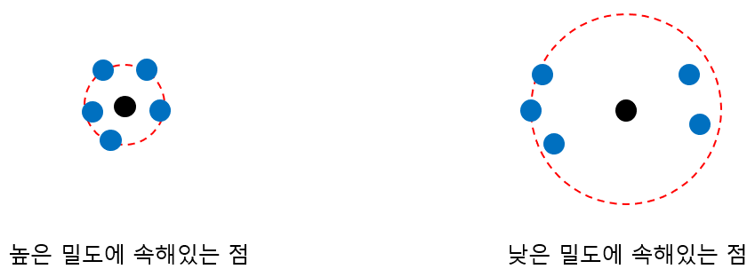 아래 그림은 밀도가 높은 곳에 포함된 점(까만 점)과 낮은 곳에 포함된 점을 나타낸 것이다. 5 거리 기반 이웃을 파란색으로 표현하였다. 일반적으로 주어진 점이 높은 밀도에 속해있다면 이웃(파란 점) 간 평균 거리가 작을(가까울) 것이고(왼쪽) 낮은 밀도에 속해있다면 이웃 간 평균 거리가 클(멀) 것이다.