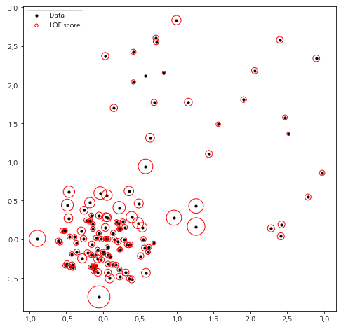 이제 구해진 LOF 값을 이용하여 각 점에 대한 점수를 빨간 원으로 시각화해 보았다. 이때 원의 반지름은 LOF에 비례하도록 설정했다.