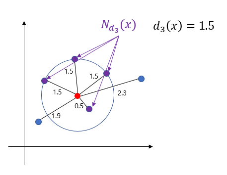 $x$의 $k$ 이웃 거리는 $d_k'(x)$는 $x$와 가장 가까운 점들을 순서대로 나열한 것을 $y_1, y_2, \ldots $이라 할 때 동점을 포함하는 $k$번째로 가까운 거리 $d(x, y_k)$를 의미한다. 이때 $y_i$는 모두 다르며 $x\neq y_i, =1, 2, \ldots$이다.