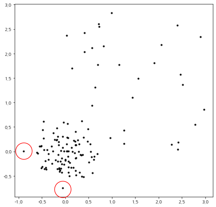 코드를 실행하면 산점도가 위와 같이 나오는데 밀도를 고려하면 빨갛게 표시된 부분이 이상치라 할 수 있으며 LOF는 이 2개의 점에 대하여 높은 값을 가져야 할 것이다.