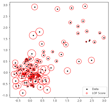 그러고 나서 negative_outlier_factor_ 속성을 통하여 LOF 값을 알 수 있는데 여기에는 음의 LOF 값으로 저장되어 있다. 이는 큰 값을 정상, 낮은 값을 이상치로 판별하기 위해 이렇게 한 것이다. 따라서 제대로 된 LOF 값을 얻으려면 앞에 마이너스 부호 '-'를 붙여줘야 한다. 아래 코드는 실험용 데이터를 이용하여 LOF를 계산하고 데이터에 대한 LOF를 표현하기 위해 LOF 값에 비례하여 커지는 원을 추가로 표시했다.