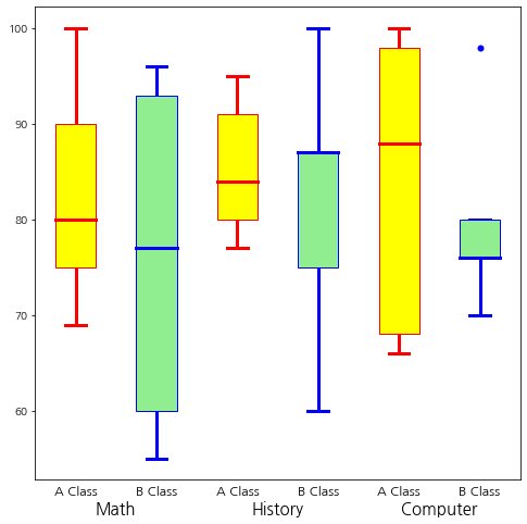 먼저 아래 코드는 A, B Class에서 5명의 수학, 역사, 컴퓨터 성적을 박스 플롯으로 그린 것입니다. 그러고 나서 A, B Class는 서브 눈금(Minor Tick) 라벨로하고 과목은 메인 눈금(Major Tick) 라벨로 설정할 것입니다. 여기서는 핵심적인 부분만 설명하기로 하고 나머지는 주석을 참고해 주세요.