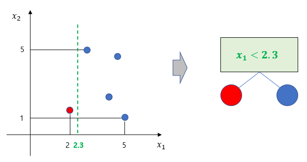 이때 $x_1<2.3$이면 왼쪽 노드로 $x_1\geq 2.3$이면 오른쪽 노드로 가게 된다. 이때 왼쪽 노드에 포함되는 데이터는 하나이므로 더 이상 분리가 되지 않는다.