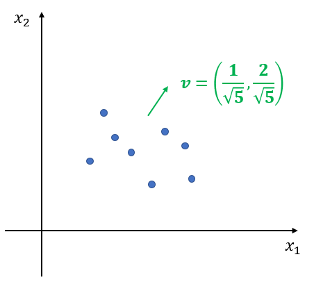이제 $p$차원 벡터 $v$를 생성한다. 생성하는 방법은 다음과 같다. 1) 각 좌표(Coordinate)에 대해서 표준 정규 분포 $N(0, 1)$에서 난수를 하나 생성한다. $i$번째 좌표에 대해서 생성된 난수값을 $v_i$라 하자. 이제 2) $v = (v_1, v_2, \ldots, v_p)$의 크기가 1이 되도록 한다. 이는 $v$의 $l_2$-norm 값으로 나누어주면 된다.