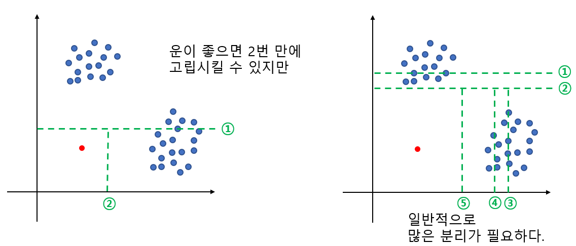 위 그림에서 파란 점은 정상, 빨간 점은 이상치이다. 이때 이상치를 고립시키기 위해 평균적으로 몇 번의 분리가 필요할까? 아래 그림을 보면 왼쪽과 같이 운 좋으면 두 번만에 고립을 시킬 수 있지만 일반적으로는 오른쪽과 같이 많은 분리 작업이 필요하다. 왜냐하면 뭔가 한 축에 대해서 고립시킬 거 같으면 다른 축에 잔챙이(정상 데이터)들이 껴있어서 이를 분리해줘야 하기 때문이다.