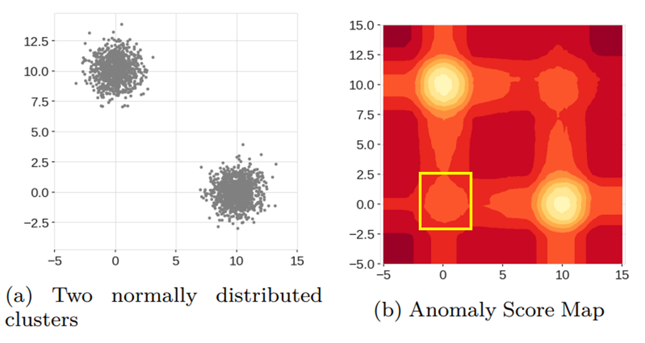 히트맵을 보면 좌하단(노란색 박스)은 데이터 분포로 봤을 때에는 이상치가 되어야 하지만 히트맵상으로는 어느 정도 밝은 영역으로 표시되어 있어 이상치인지 정상인지 구분하기가 애매할 수 있다.