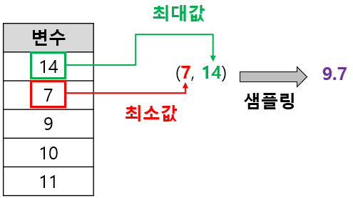 연속형 변수는 학습 데이터에서 그 변수가 취할 수 있는 최소값과 최대값 사이에서 균등 분포 샘플링을 통해 숫자를 하나 선택하게 된다. 아래 그림은 연속형 변수에 대한 분리 값을 선택하는 과정을 나타낸 것이다. 랜덤하게 선택된 변수 중 하나가 아래와 같다면 최소값은 7, 최대값은 14이므로 7과 14 사이에 (균등 분포) 난수 하나를 생성하면 되는 것이다(아래 그림에선 9.7이 나왔다고 가정).