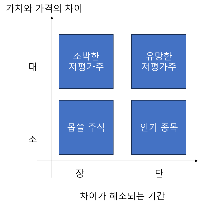 가치와 가격의 차이가 크냐 작냐, 그 차이가 해소되기까지의 기간이 긴지 짧은지에 따라서 '유망주 매트릭스'로 세분화할 수 있다.
