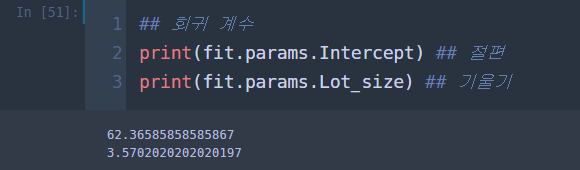 절편항은 Intercept를 통하여 기울기는 해당 변수 이름으로 접근하여 얻을 수 있습니다.