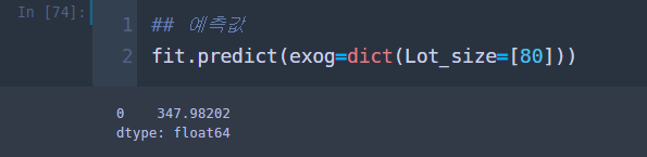 위 코드와 같이 predict 함수의 exog인자에 설명 변수 이름과 해당 값을 딕셔너리로 넘겨주셔야 합니다.
