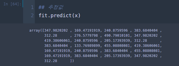 그리고 새로운 데이터 즉, 새로운 제품 크기에 대한 작업 시간의 예측값을 얻고 싶다면 다음과 같이 해주세요.
