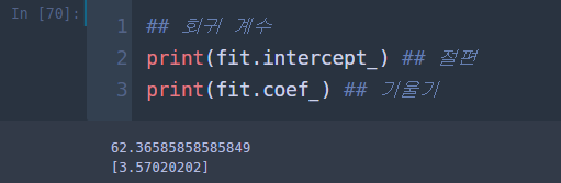 절편은 약 62.37, 기울기는 약 3.57으로 추정되었습니다. 이는 앞서 본 것과 동일합니다.