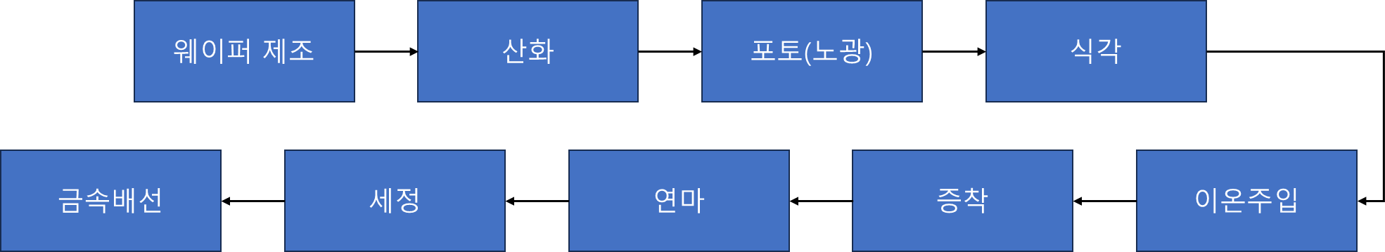 반도체는 실리콘 재질의 원판인 웨이퍼 위에 회로를 그려서 만들어진다. 아래 그림은 반도체 공정을 나타낸 것이다. 이에 대한 내용은 다음 포스팅에서 다뤄보려고 한다.