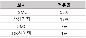 시스템 반도체는 팹리스(설계)와 파운드리(제조)를 통해 만들어 진다. 팹리스는 시스템 반도체를 설계하는 것이며 파운드리는 설계도를 받아 제조하는 것을 말한다. 아래표는 시스템 반도체 파운드리 점유율을 나타낸 것이다.