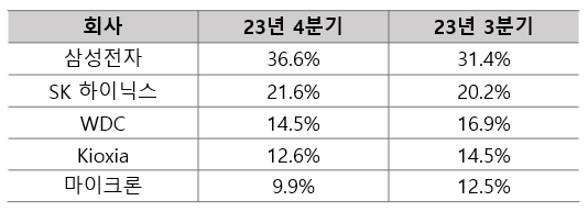 반도체 종류별 점유율을 알아보자. 아래 표는 주요 반도체 제조사의 D램과 낸드 플래시 매출액 점유율과 을 나타낸 것이다.