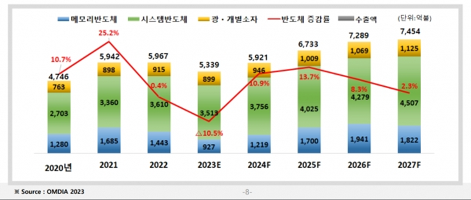 옴디아에 따르면 2023년 글로벌 반도체 시장은 전년 대비 10.5% 줄어든 5,290억 달러로 2019년 이후 4년 만에 역성장을 기록할 것으로 추정됐다. 하지만 향후 4년간(2024년~2027년) 점진적 회복세를 보일 정망이다. 2024년에는 5,921억 달러, 2025년 6,733억 달러, 2026년 7,289억 달러, 2027년 7,454억 달러로 연평균 8.8% 성장이 예상된다. 특히 메모리 반도체 시장은 이 기간에 연평균 19.8% 성장할 것이라고 옴디아는 예상했다. 시스템반도체와 광·개별소자는 각각 6.4%, 5.8% 수준 성장이 예상된다.