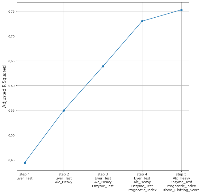 전진 선택법을 적용한 결과 'Liver_Test', 'Alc_Heavy', 'Enzyme_Test', 'Prognostic_Index', 'Blood_Clotting_Score'가 최종 변수로 선택되었습니다. 꽁냥이는 각 스텝별로 모형의 적합 정도를 확인하기 위한 그래프를 그려보았습니다.
