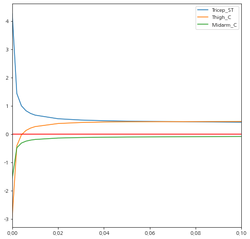 위 그림은 $\lambda$ 값에 따른 분산 팽창 인자입니다. $\lambda$=0.02인 경우 세 변수의 분산 팽창 인자는 각각 1.1026, 1.0801, 1.0105로 이는 $\lambda$=0인 경우(708.8429. 564.3434, 104.6060) 보다 충분히 작으므로 최적 $\lambda$값을 0.02로 정했습니다.