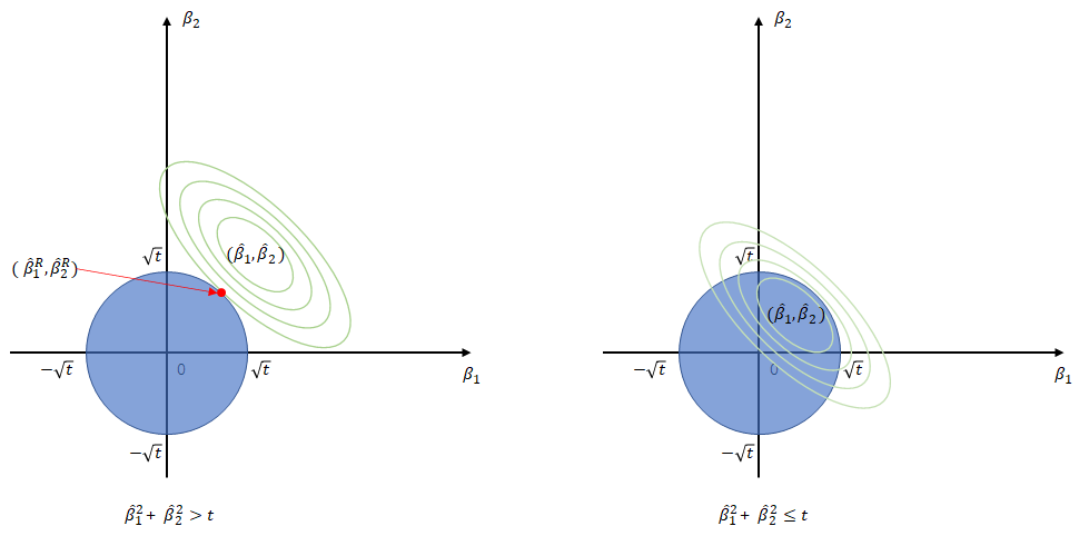 위 그림에서 연두색 등고선은 $f(\beta_1,\beta_2)=\sum_{i=1}^n(y_i-\beta_1x_{i1}-\beta_2x_{i2})^2$의 그래프를 나타낸 것이며 파란색 영역은 양수인 $t$에 대하여 $\{(\beta_1,\beta_2) : \beta_1^2+\beta_2^2\leq t\}$를 나타낸 것입니다. 그리고 $(\hat{\beta}_1, \hat{\beta}_2)$는 최소 제곱 회귀 추정량, $(\hat{\beta}_1^R, \hat{\beta}_2^R)$은 능형 회귀 추정량입니다. 먼저 오른쪽 그림을 보면 최소 제곱 회귀 추정량이 파란색 영역 안에 있는 상황이며 이때에는 능형 회귀 추정량과 최소제곱추정량은 일치하게 됩니다. 왼쪽 그림은 최소제곱회귀추정량이 파란색 영역 밖에 있는 상황이며 이 때에는 연두색 등고선이 파란색원과 접하는 지점의 좌표가 능형 회귀 추정량이 됩니다. 왜냐하면 $f(\beta_1,\beta_2)$ 값은 $(\hat{\beta_1}, \hat{\beta_2})$에서 멀어질수록 커지기 때문입니다.