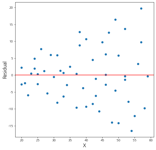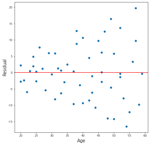 먼저 오차의 등분산성을 확인하기 위해 잔차도를 그려볼 거예요. 아래 코드는 설명 변수(Age)에 따른 잔차의 산포도를 그린 것입니다.