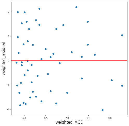 이제 $\hat{\beta}^{\text{WLS}}$을 이용하여 다시 잔차도를 그려보겠습니다.