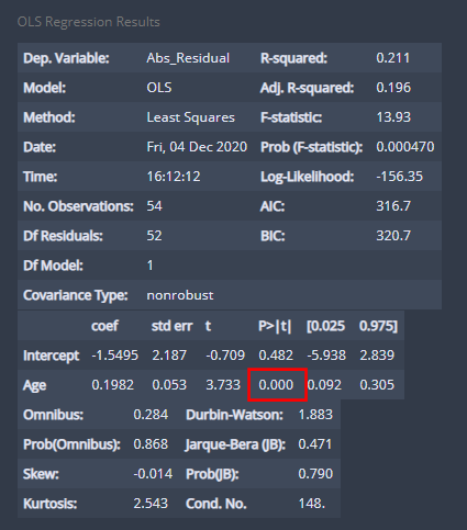 std_fit = ols('Abs_Residual~Age',data=df).fit() ## 잔차의 절대값 ~ 연령