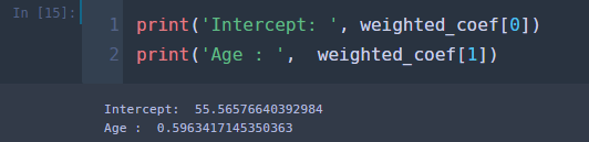weighted_coef = np.matmul(XtWX_inv,XtWy) ## weighted least square estimator of slope